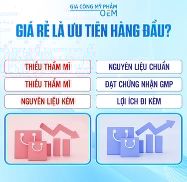 Khi bước chân vào con đường xây dựng một thương hiệu mỹ phẩm riêng, một trong những quyết định đầu tiên và quan trọng nhất chính là lựa chọn đối tác gia công (OEM). Giữa vô vàn lời mời chào, bài toán chi phí thường được đặt lên bàn cân. Nhiều người cho rằng, tiết kiệm chi phí sản xuất ban đầu sẽ tạo ra lợi thế cạnh tranh về giá. Nhưng liệu "giá rẻ" có thực sự là ưu tiên hàng đầu? Hình ảnh trên đã đưa ra một sự so sánh trực quan và đắt giá giữa hai con đường: một bên là cạm bẫy của "giá rẻ" và một bên là nền tảng vững chắc của "chất lượng".