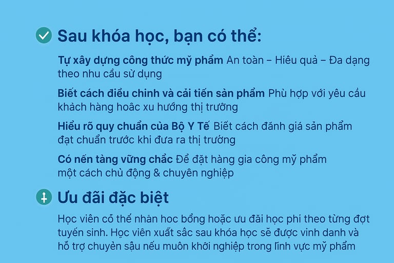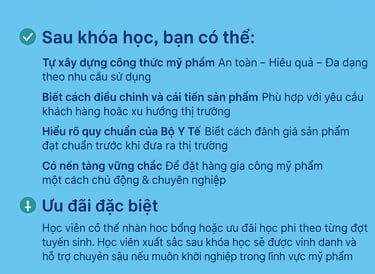 Khóa học toàn diện giúp học viên làm chủ kỹ năng sản xuất mỹ phẩm thiên nhiên, organic và nắm chắc kiến thức thực tiễn – từ công thức đến pháp lý.